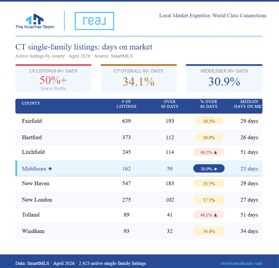 Data sourced from SmartMLS, April 2026. National data sourced from Redfin. Statistics reflect active single-family listings in Connecticut at time of publication.